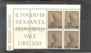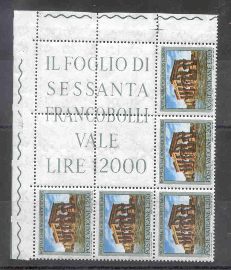 In a few occasions stamps were issued in sheets of 64 (8 x 8) or 56 (7 x 8). In order to keep the math simple, an upper corner block of 4 of each set contained the marginal inscription usually seen in the margins around the sheet. This is usually "Il Foglio di sessanta Francobololli ..." which is "A sheet of 60 stamps...".