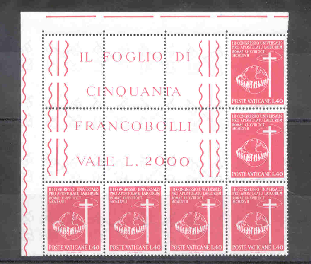 A vast majority of Vatican City stamps are issued in sheets of 40, 50 or 100 stamps to a sheet depending on the printing process. The stamps were issued in rows of 8 or 10 with 5 stamps in a column, or in 10 by 10 sheets.